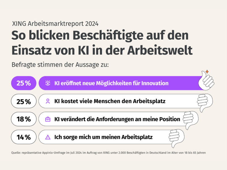 Hamburg, 22. November 2024 – Deutsche Beschäftigte haben ein gespaltenes Verhältnis zu Künstlicher Intelligenz: Ein Viertel der Befragten (25 %) geht davon aus, dass sie viele menschliche Arbeitsplätze kosten wird. Genauso viele glauben allerdings, dass sie neue Möglichkeiten für innovative Projekte und Lösungen eröffnet. Und jeder Fünfte (21 %) ist der Meinung, dass es ethische Fragen hinsichtlich der Nutzung von KI gibt, die Unternehmen und Gesellschaft sorgfältig berücksichtigen müssen. Angst um den eigenen Arbeitsplatz haben jedoch mit 14 Prozent vergleichsweise wenige. Das geht aus dem repräsentativen XING Arbeitsmarktreport 2024 hervor, den das Marktforschungsinstitut Appinio im Auftrag des Jobs-Netzwerks unter 2.000 Beschäftigten und 300 Recruitern in Deutschland im Rahmen einer Online-Umfragedurchgeführt hat.