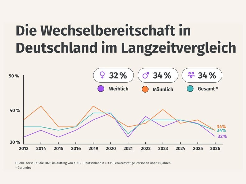 Hamburg, 4. Februar 2026 – Die schwierige wirtschaftliche Lage wirkt sich auf die Arbeitswelt der Beschäftigten in Deutschland aus: Mit aktuell 34 Prozent ist die Jobwechselbereitschaft der Erwerbstätigen im Vergleich zu den Vorjahren rückläufig. Sehr oder eher große Sorgen um den Verlust ihres Arbeitsplatzes im laufenden Jahr machen sich jedoch nur 8 Prozent der sozialversicherungspflichtigen Beschäftigten. Knapp zwei Drittel (63 %) sind darüber hinaus der Überzeugung, innerhalb eines halben Jahres eine neue Stelle finden zu können. Auf der Wunschliste an einen neuen Arbeitgeber stehen dabei vor allem langfristige Jobsicherheit (70 %) und höheres Gehalt (63 %). Die forsa-Studie im Auftrag des Job-Netzwerks XING wird seit 2012 durchgeführt.