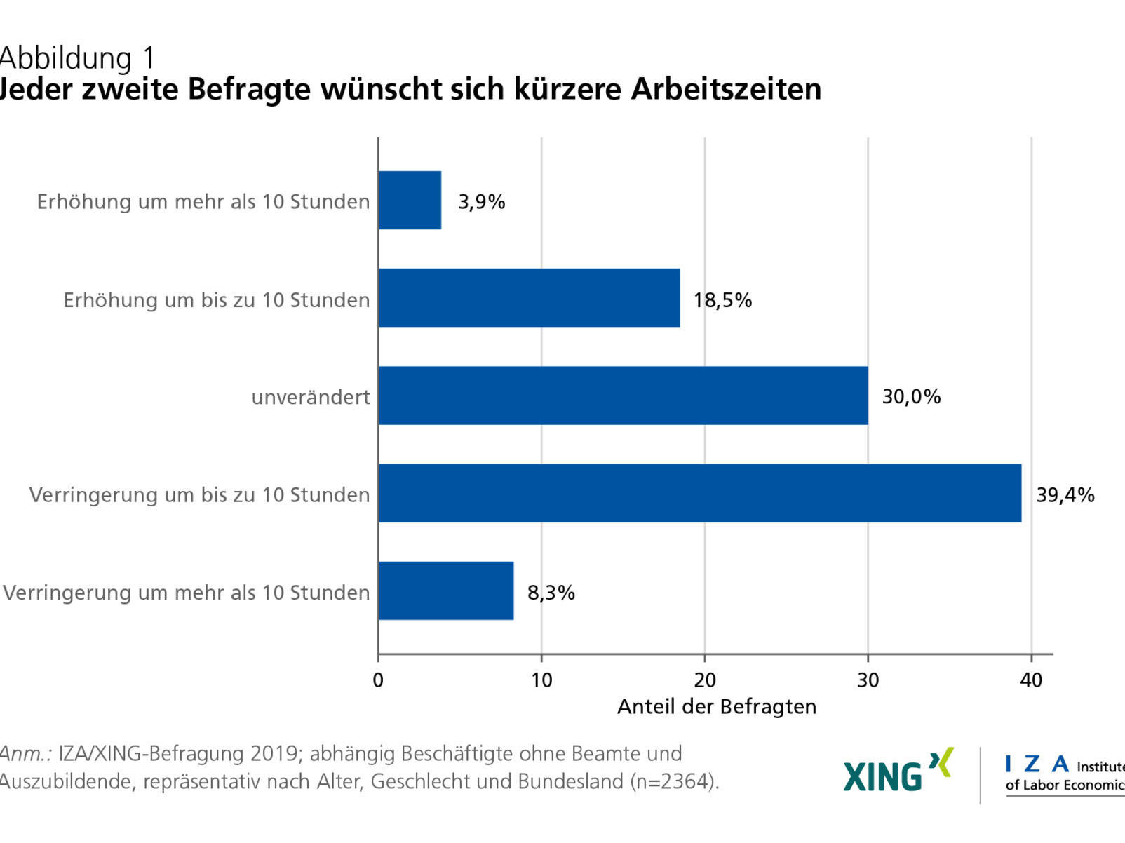 Die Studie „Arbeiten in Deutschland“ wurde Anfang 2017 vom Institut zur Zukunft der Arbeit (IZA) und XING gestartet. Anfang 2019 wurde bereits die dritte Befragungswelle dieser gemeinsamen Initiative abgeschlossen, um vor dem Hintergrund des fortschreitenden Wandels der Arbeitswelt neue Erkenntnisse über die Zukunftsperspektiven der Bevölkerung in Deutschland zu gewinnen. Die IZA/XING-Studie setzt sich aus zwei Befragungsteilen zusammen – einer nationalrepräsentativen Online-Umfrage mit rund 3.000 Teilnehmern sowie einer Online-Befragung von bis zu 6.000 zufällig ausgewählten XING-Mitgliedern. Bislang sind folgende Ergebnisse erschienen: